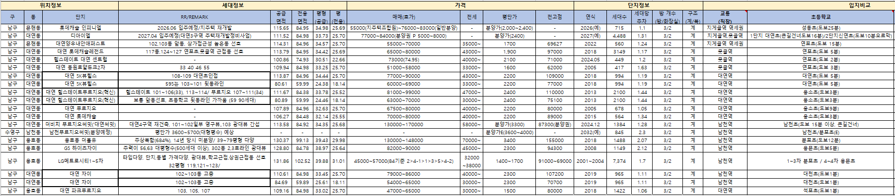 지난번에 '남구' 임장을 갔을때는 부동산 임장을 하는 중간중간에 부동산 어플을 켜서 연식이나 세대수, 매물 호가, 전고점 등을 실시간으로 확인했었다. 때문에 시간이 오래 걸리기도 하고, 단체로 이동하다 보니 궁금하지만 그냥 지나쳤던 부분이 많았던 것 같다. 그래서 이후 임장 부터는 임장 전 손품을 팔아서 작성한 입지비교표를 가지고 분임을 나가게 되었다. 이번 남구 분임에도 입지 비교표를 가지고 간 덕분에 비슷한 입지의 아파트를 쉽게 비교해 볼 수 있었던 것 같다.