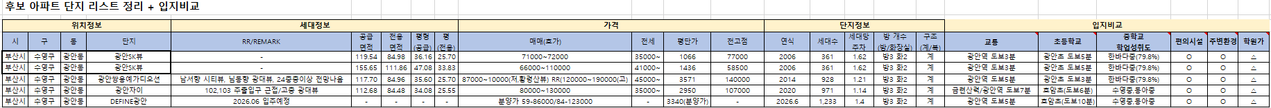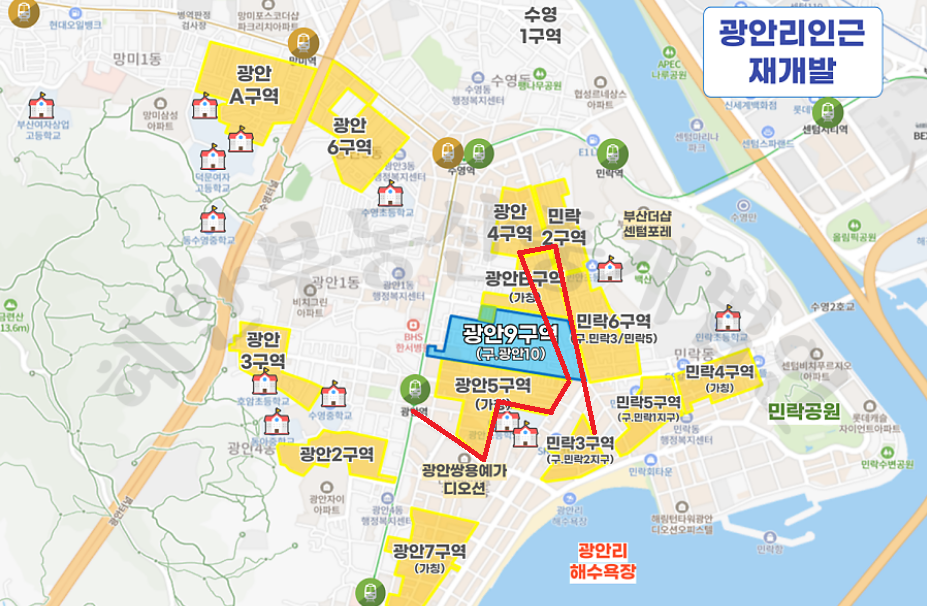 입지 : 광안대교와 광안리 해변과 인접해 있으며, 뛰어난 조망권과 생활 인프라를 갖춘 지역, 광안초, 민안초, 한바다중 바로 근접. 초기 재개발 지역이긴 하지만 지리적 입지조건, 재개발 사업성은 좋을 듯