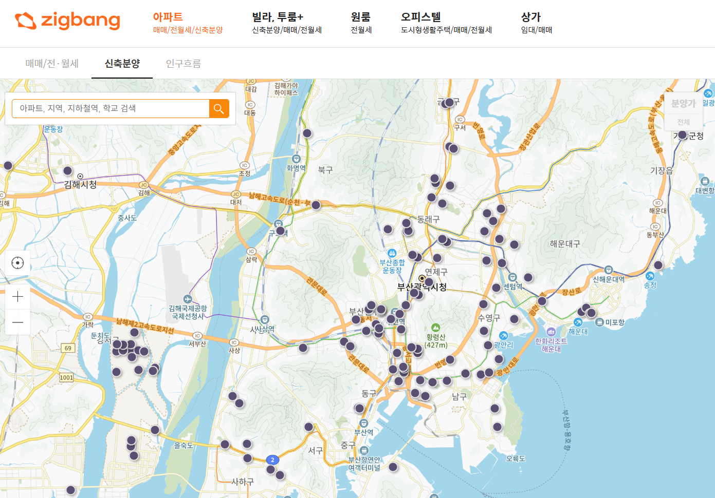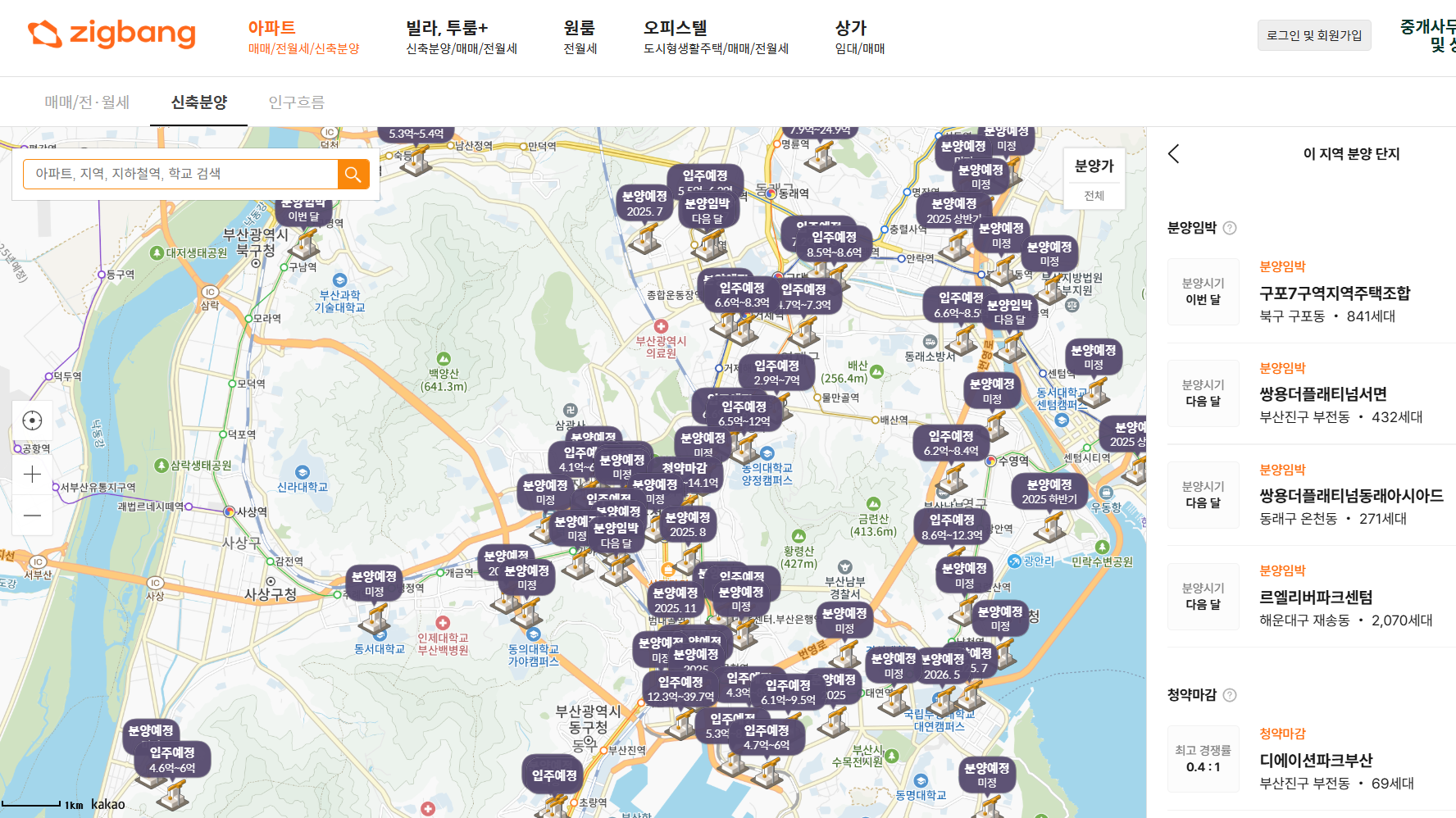 4. 직방- 아파트->신축분양-> 공급, 분양예정 입지 및 분포 확인 용이